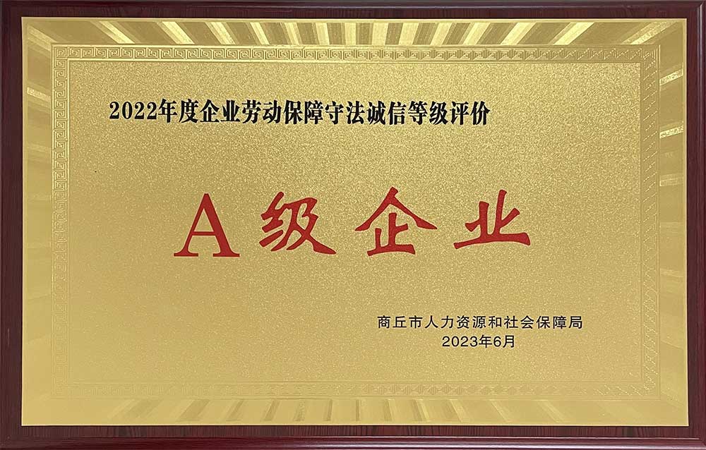 我公司近日獲得商丘市人力資源和社會(huì)保障局頒發(fā)的勞動(dòng)保障守法誠信A級企業(yè)榮譽(yù)證書,這是對公司長期以來遵守勞動(dòng)法律法規(guī)、維護(hù)勞動(dòng)者權(quán)益、規(guī)范市場行為及保持良好社會(huì)形象等方面給予的充分肯定。
